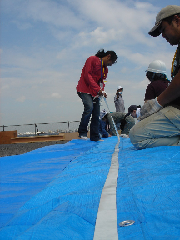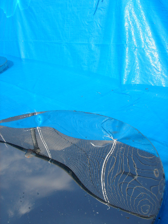 ブルーシートのプールを制作。シートをつなぎ合わせて、木などで囲いを作り、フェンスに固定。ポンプで海水を