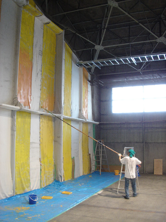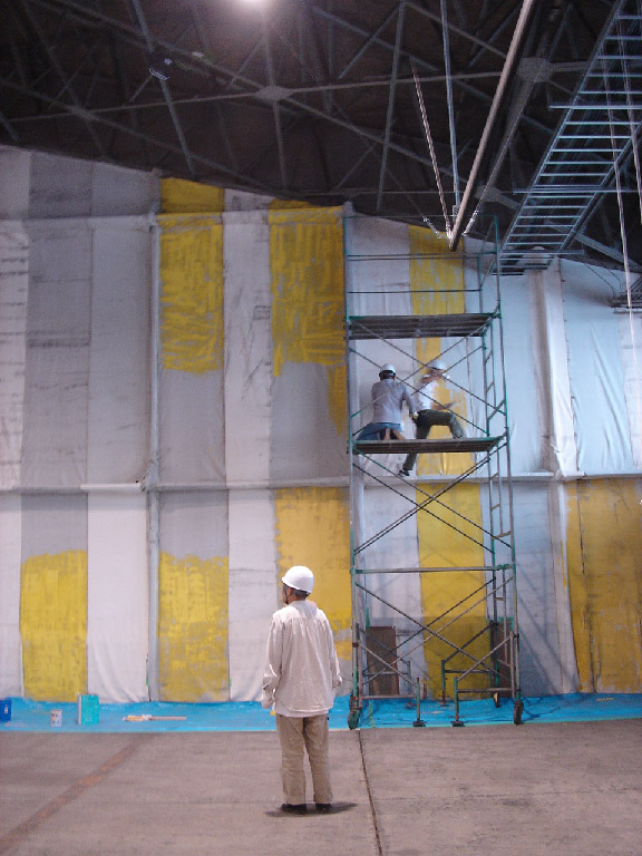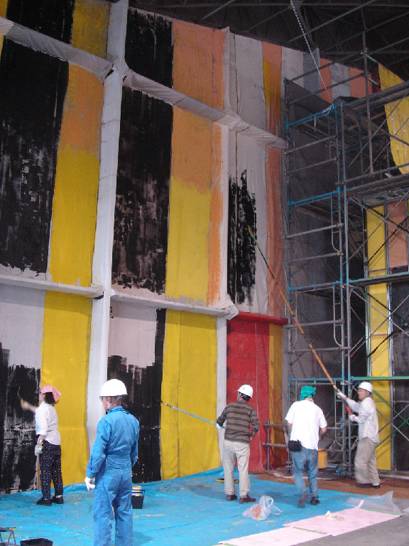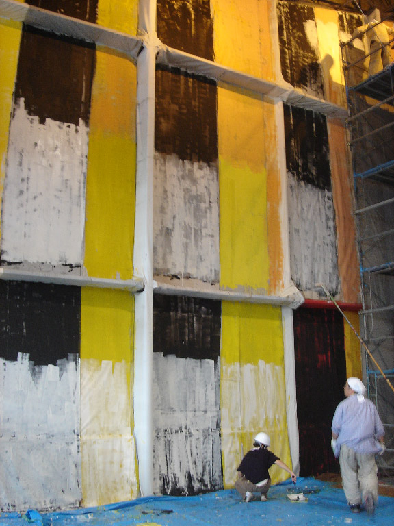 本日は招待客やプレスのみが入れるプレオープンの日。まずは壁塗りをして黒と黄色のシマシマに。