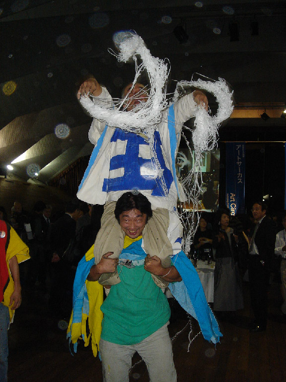ド派手なあの服。兵庫運河でやった空気美術館の最後に、やなか&もりわきで広告旗で100着作った服を着て