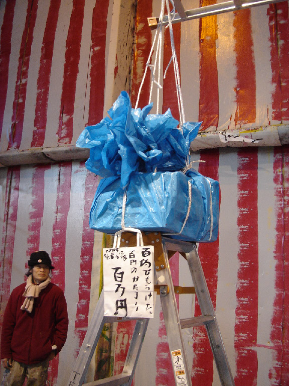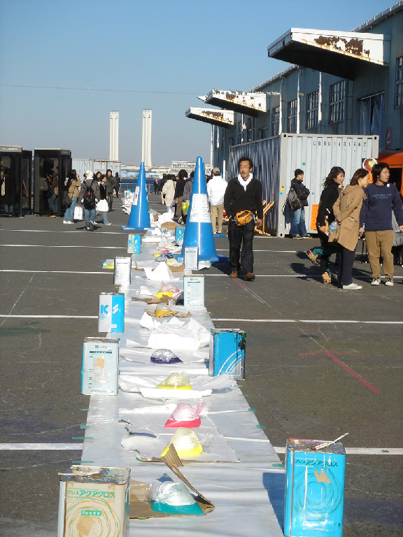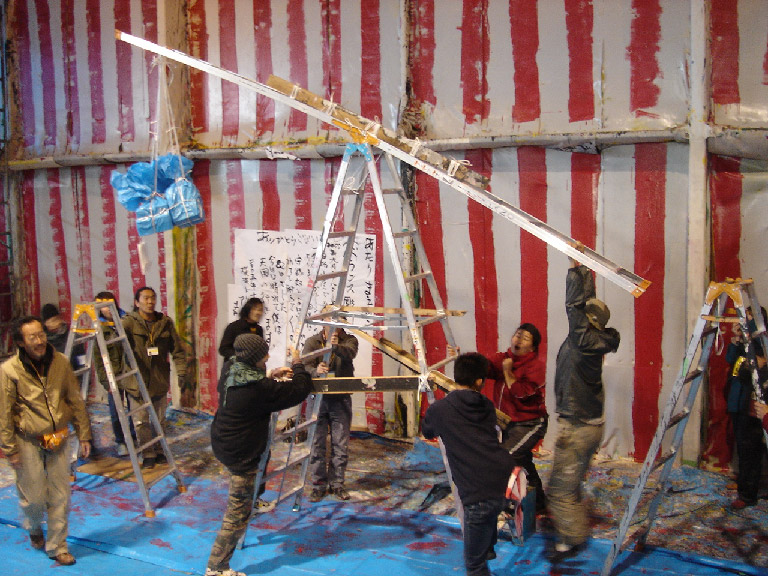 みんなでかたどりました。そして引き続き百均小屋の前でバランス彫刻。百均絵画は1万枚・100万円を達成しました。
