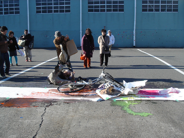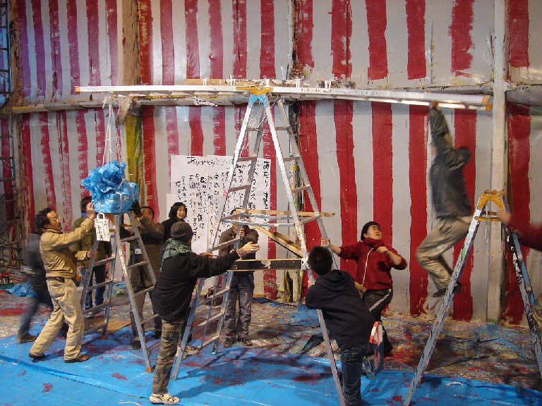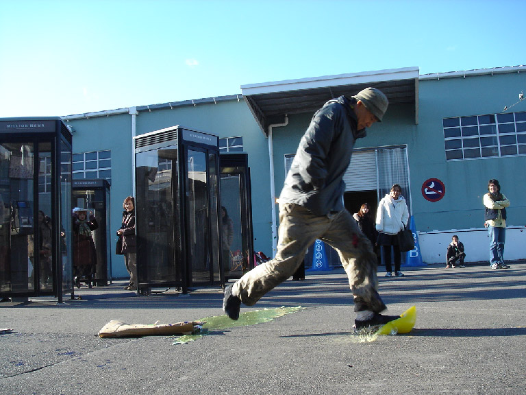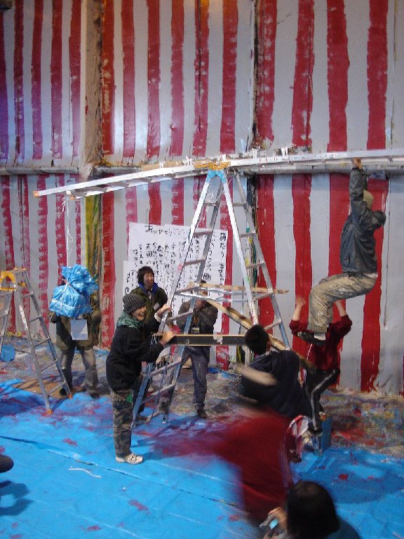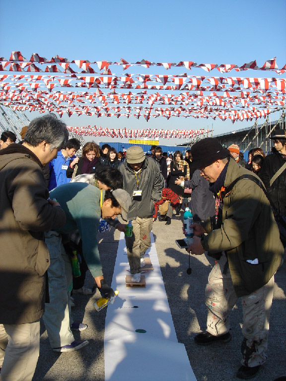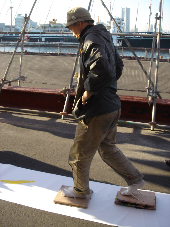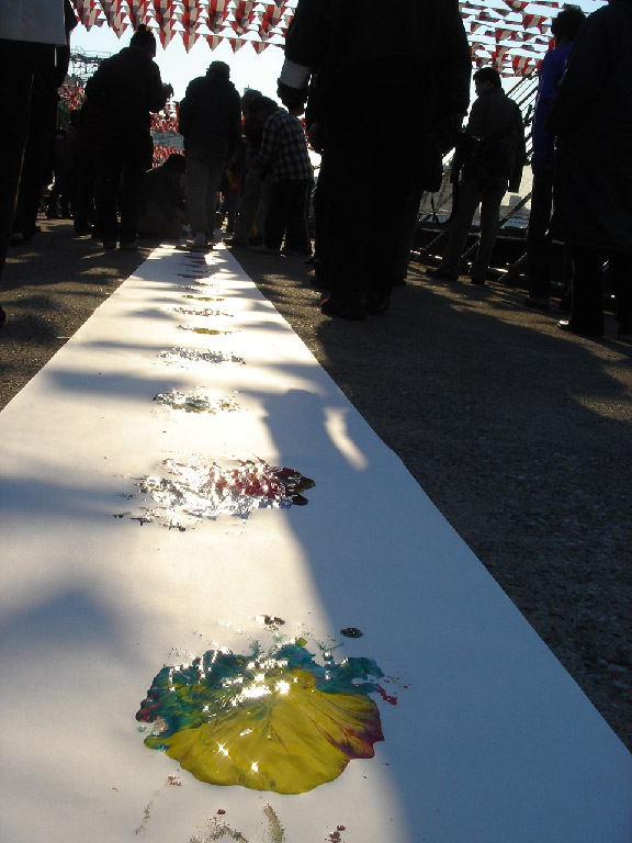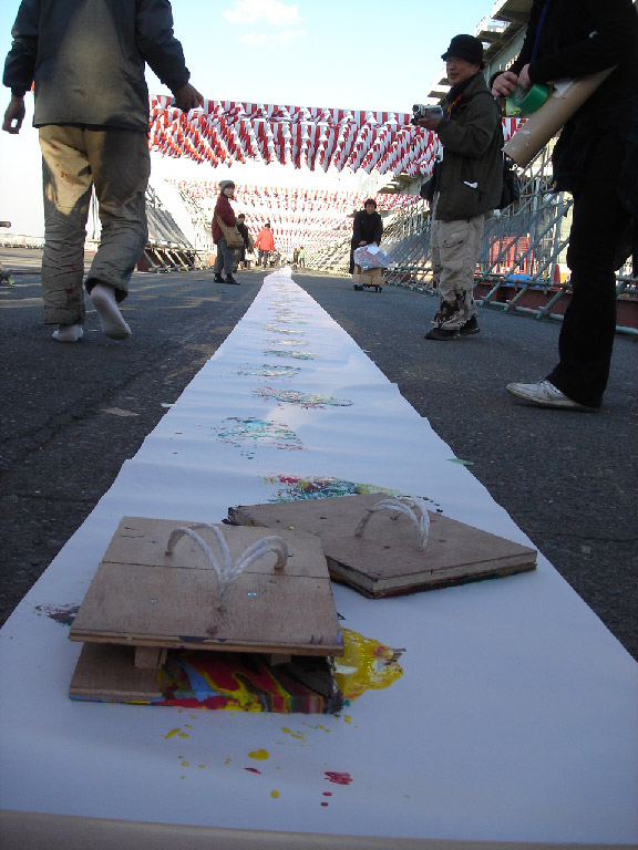 くそふんじゃった−パリの空の下で−です。長い長ーいロール紙の上にペンキをたらしてそれを堀尾さんが