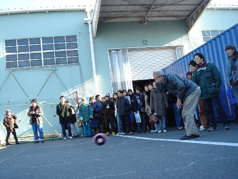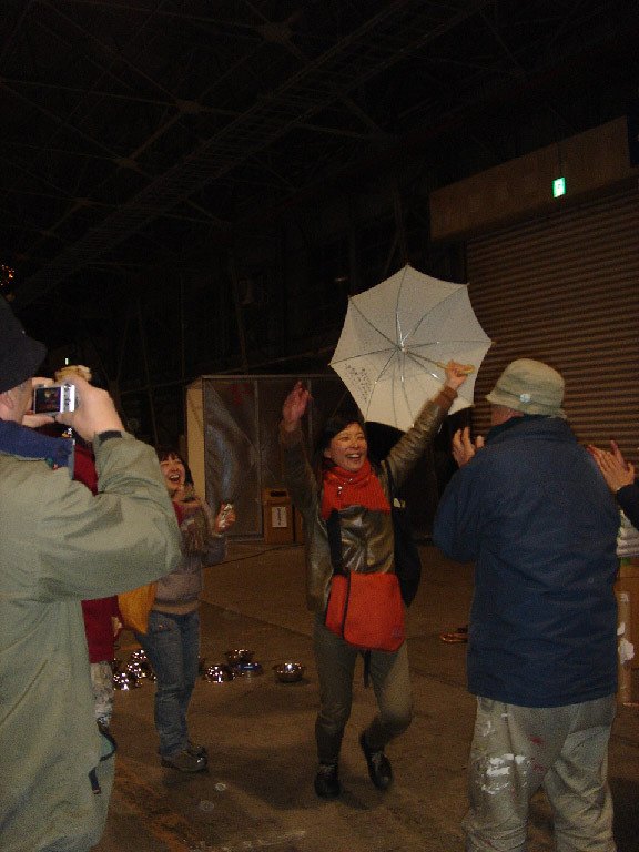 突然パフォーマンスがはじまる!誰かが金属のボールを落としたら「エエ音やなぁ」と言い、どんどん落としていく。
