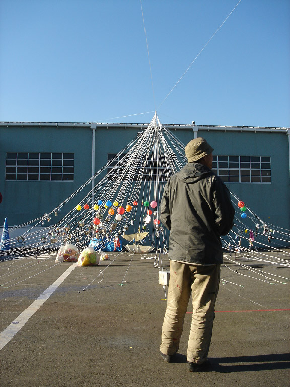 天秤づくりから開始。脚立の上にはしごにした脚立を固定。意外に丈夫だったので一安心。ナカニワには色んな国の