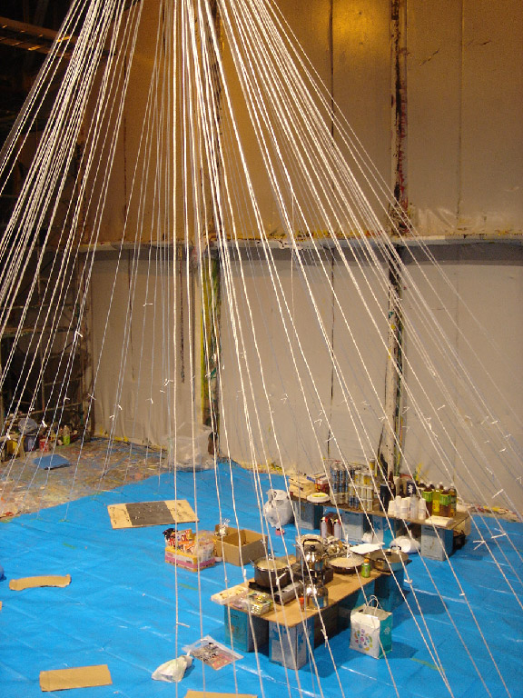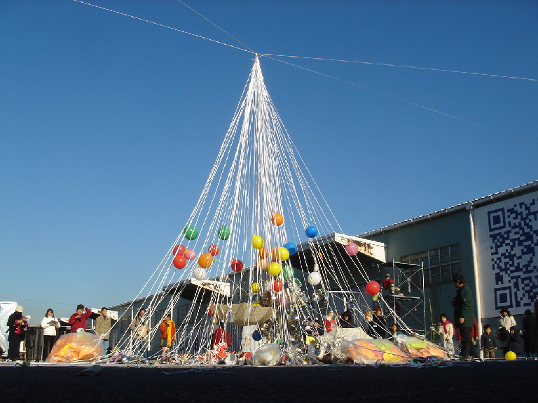 パフォーマンスの「クラッシュ」の準備です。クラッシュは紐の先に色んなものを結んでそれぞれをお客さんに持ってもらい