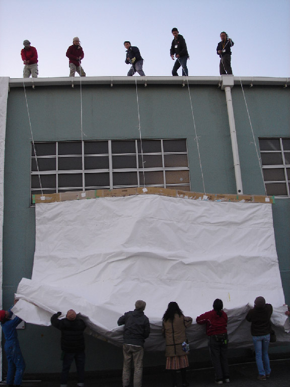 巨大スクリーンはサポーターの方が作ってくれた力作です。なんとこのスクリーンは袋になっていて膨らむんです!
