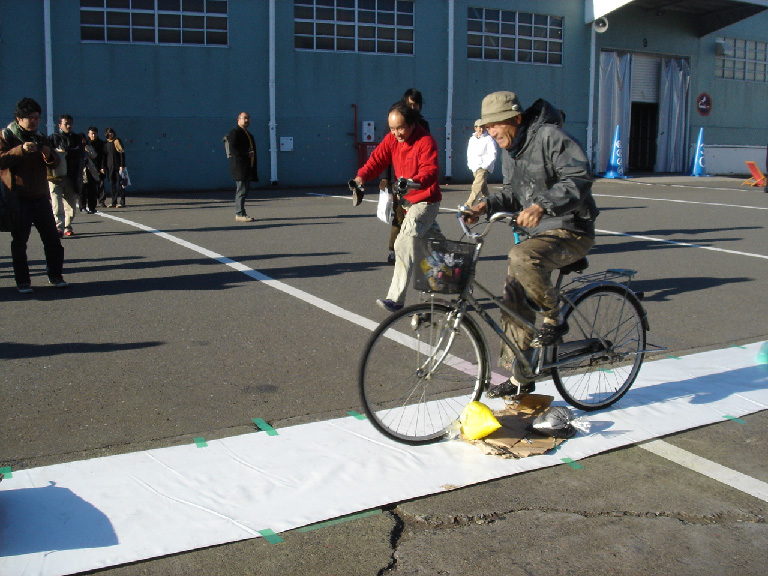 堀尾さん・清水さんが自転車で踏んでいきます。自転車で踏むのってけっこう難しいんですねぇ。何往復もしているうちに
