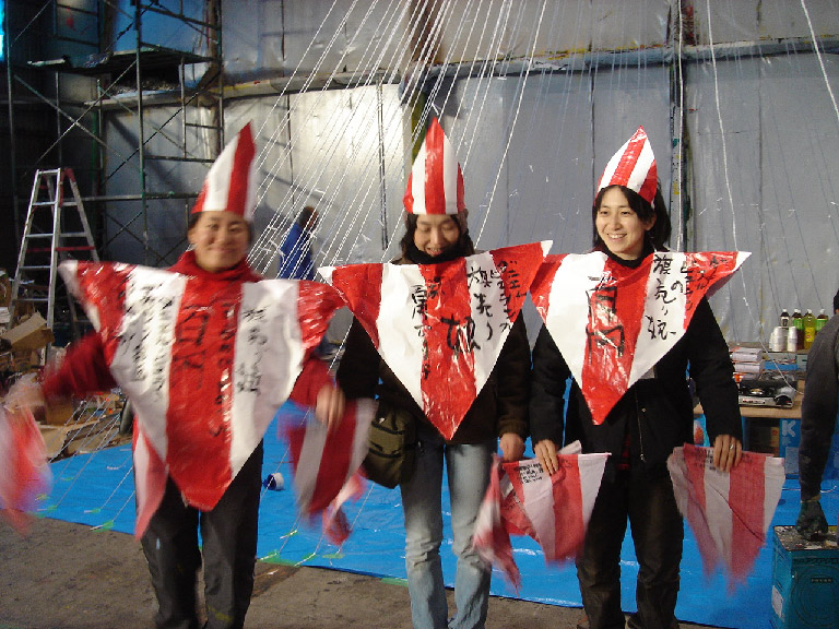 いよいよ最後の土日です。予想以上にお客さんで会場はいっぱいです。昨日の旗売り娘の衣装が好評で