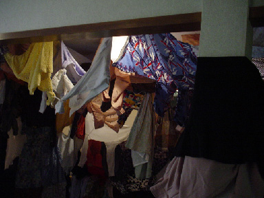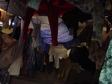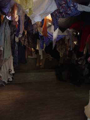 部屋の内側を包み込む感じで天井から古着の袖が垂れていたり