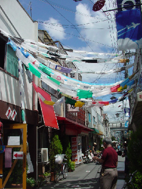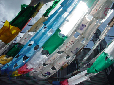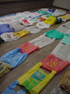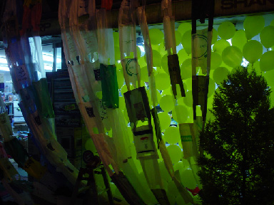 もうひとつが借りた空き店舗の前の商店街を横切る形でスーパーの袋などを